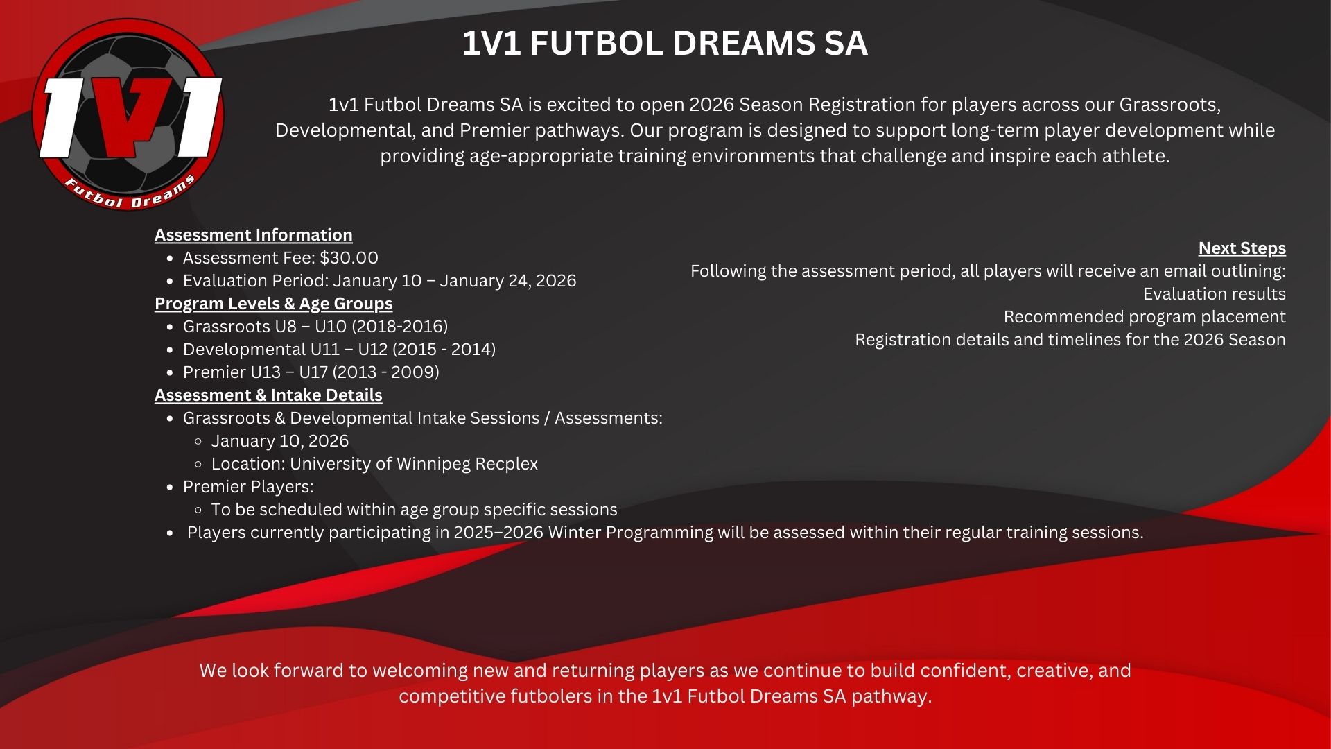 We’re excited to officially open 2026 Player Assessment Registration for 1v1 Futbol Dreams Soccer Academy!