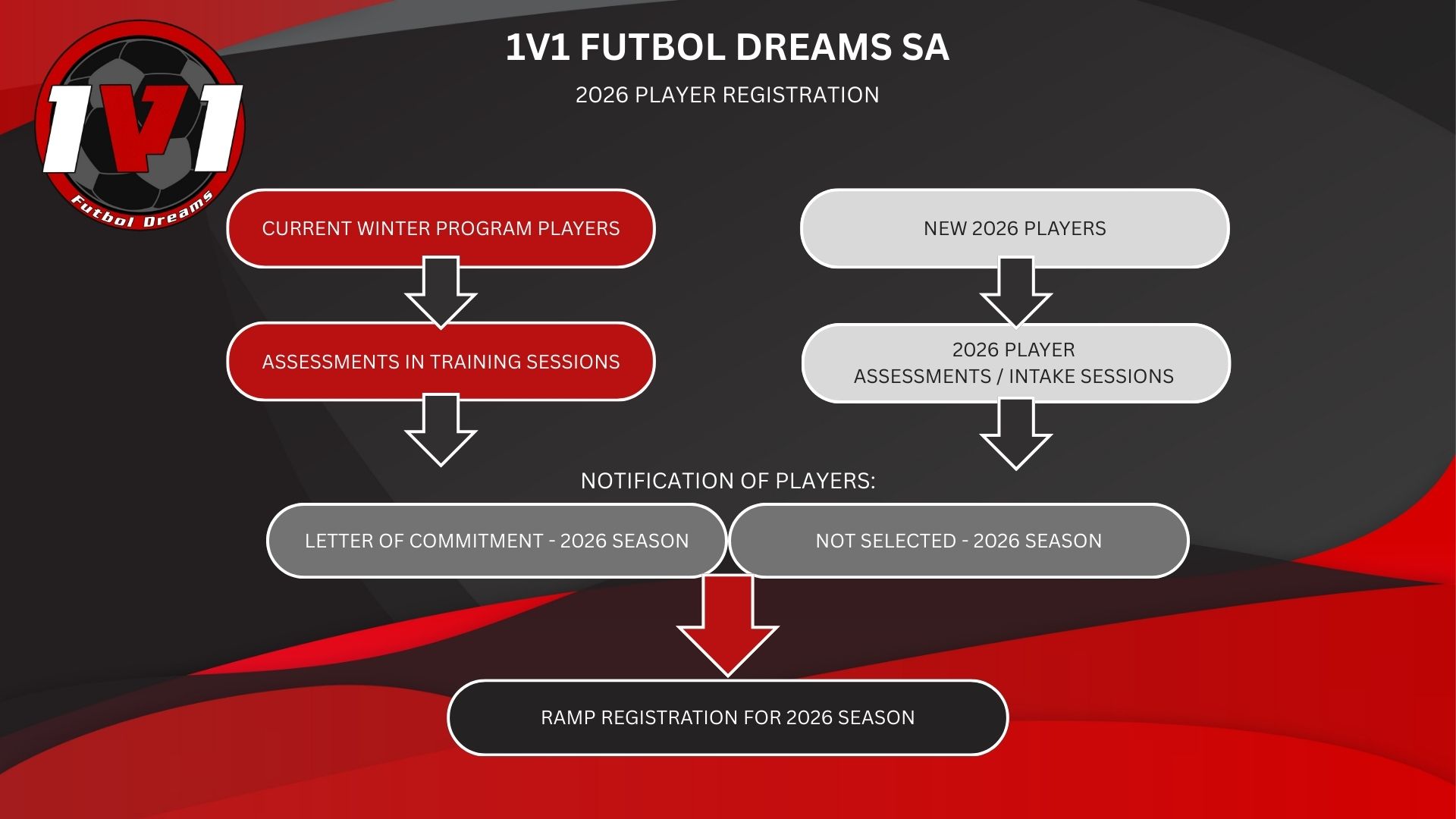 1v1 Futbol Dreams SA - 2026 Player Assessment RegistrationWe’re excited to officially open 2026 Player Assessment Registration for 1v1 Futbol Dreams Soccer Academy!
